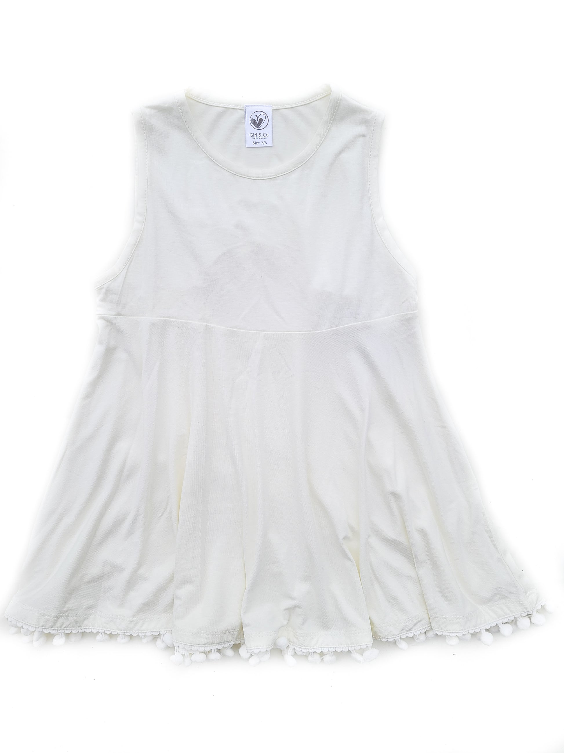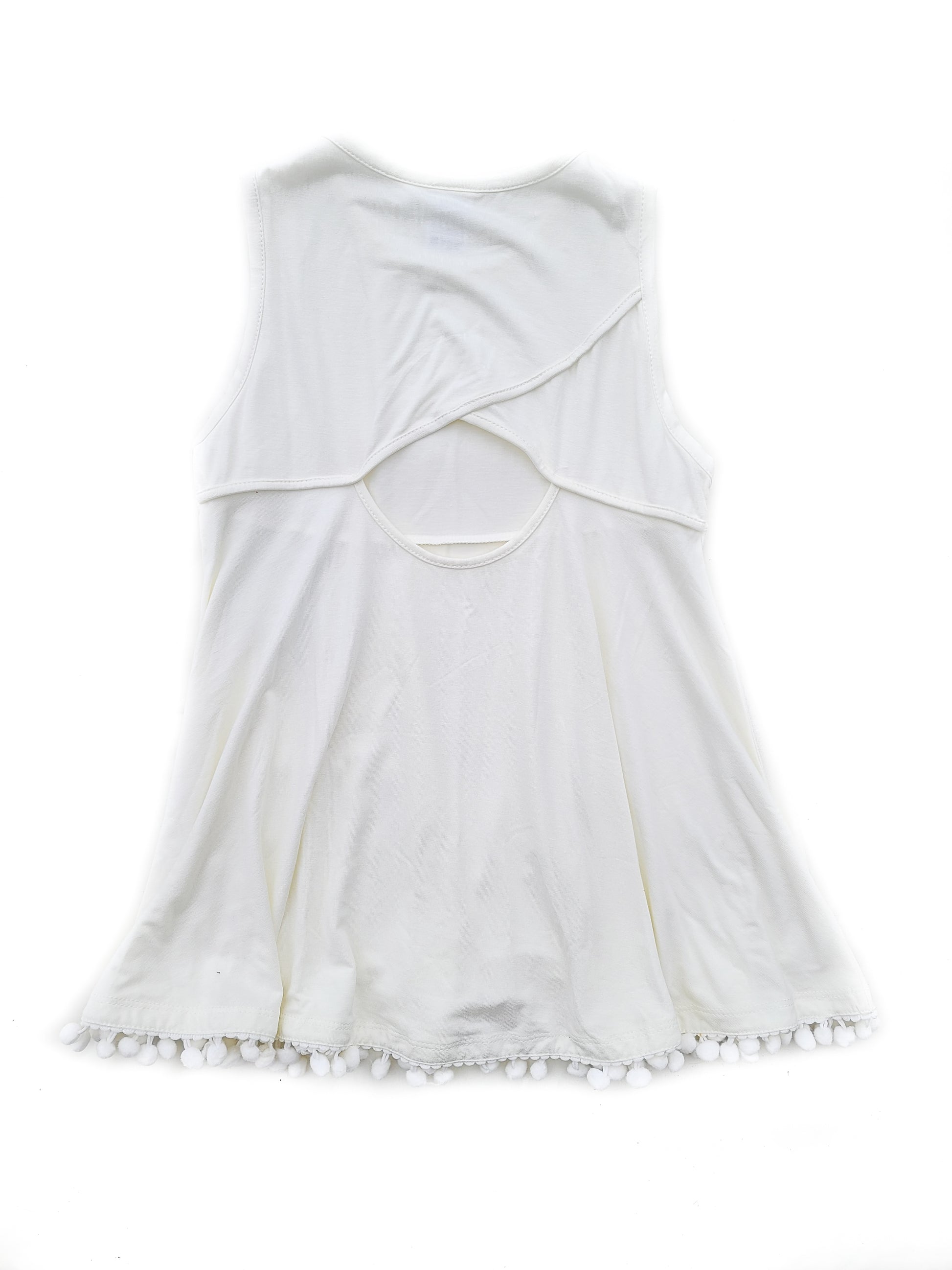 Ivory flared tank top featuring an open cutout in the back and a bobble hemline.