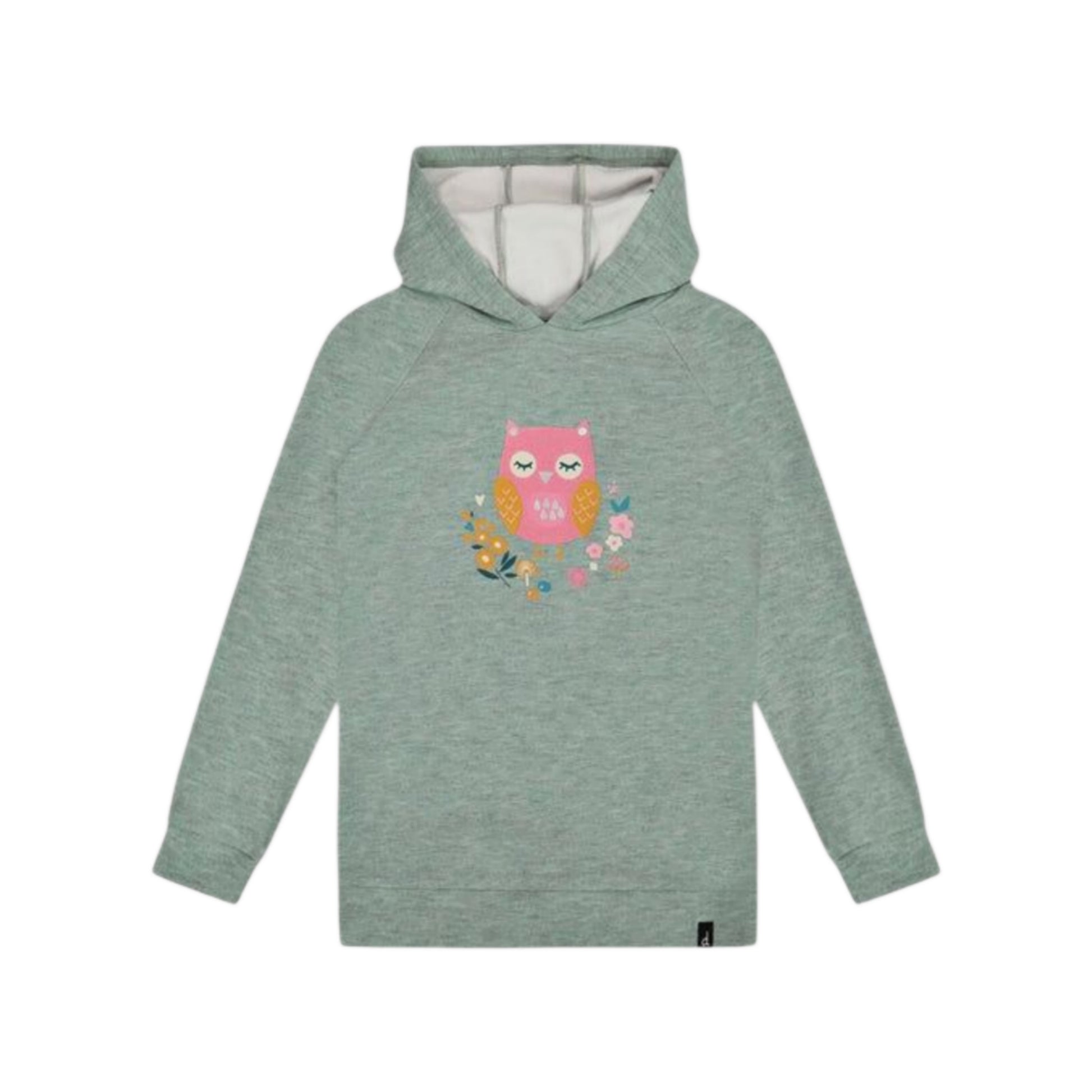 This super soft brushed jersey top features long raglan sleeves, a relaxed hood, and a playful owl illustration with floral accents.