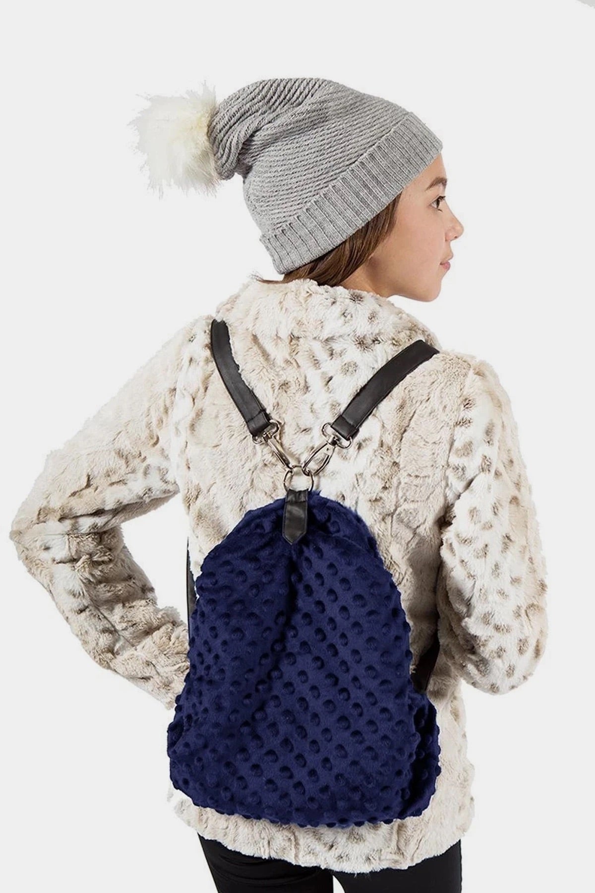 Our super soft minky bubble, now in a stylish accessory. The navy bubble back pack is super plush and stylish with adjustable black leather straps. Also comes with a zipper compartment for little essentials.