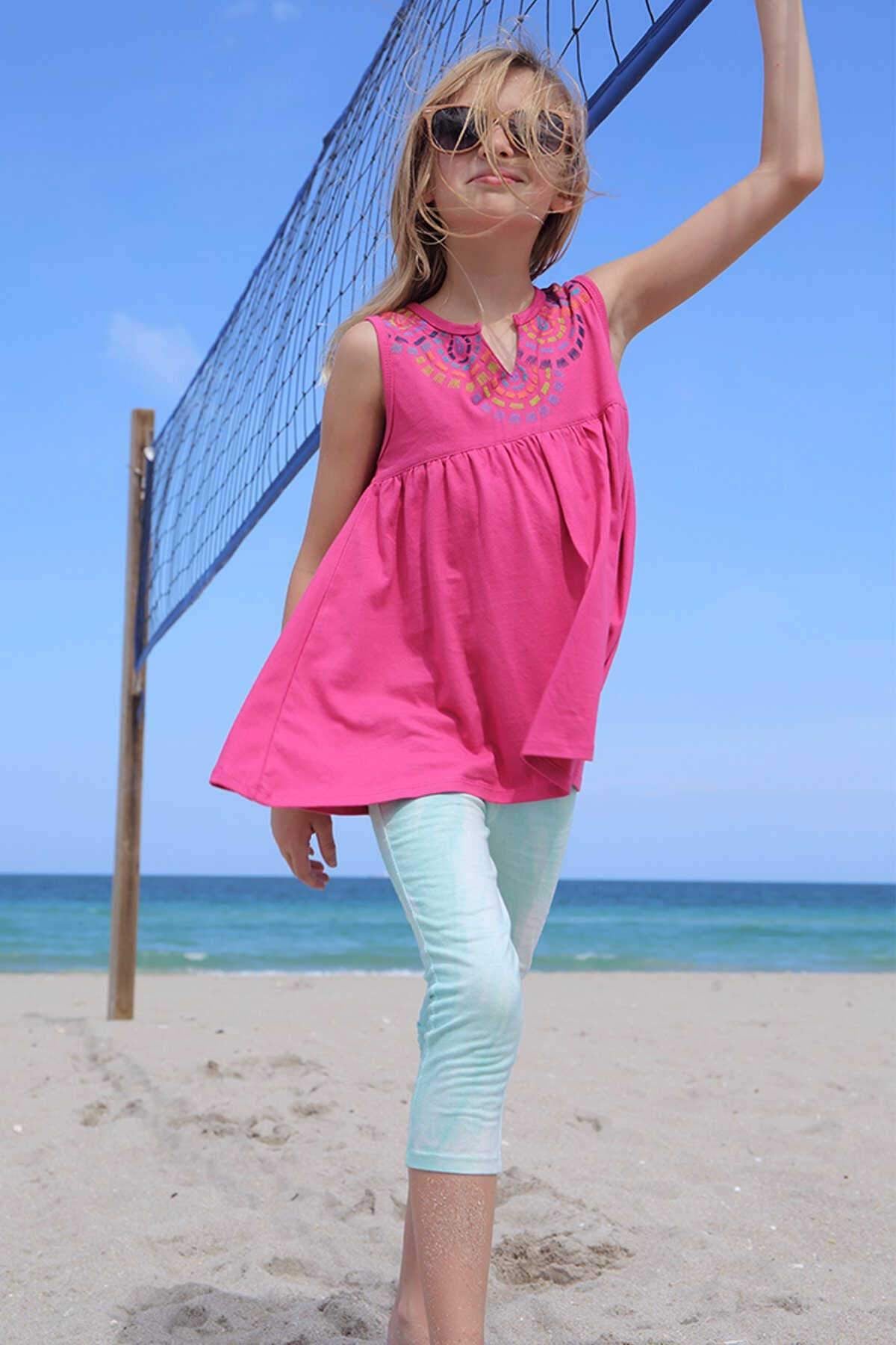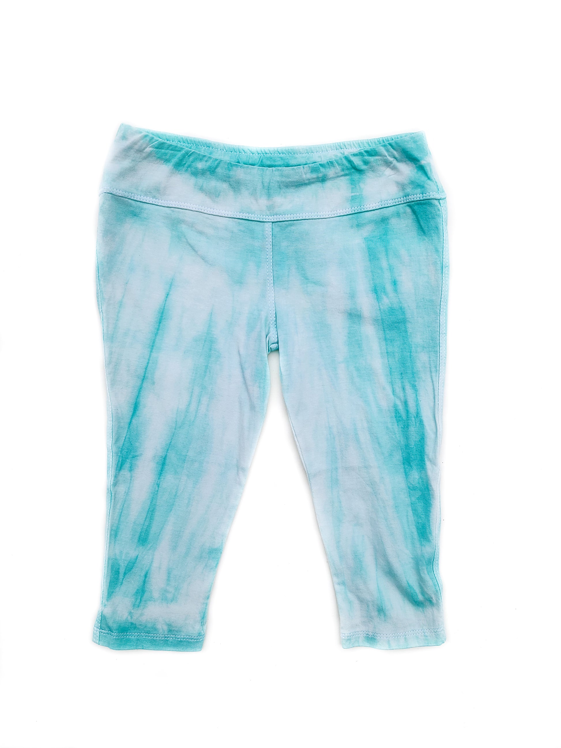 These capri leggings feature a banded waist for comfort and are a white and green tie dye style.