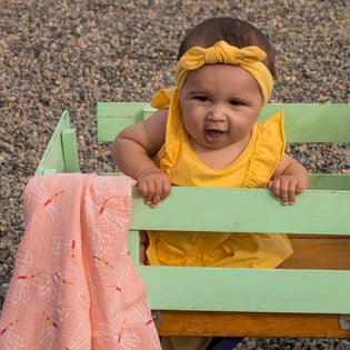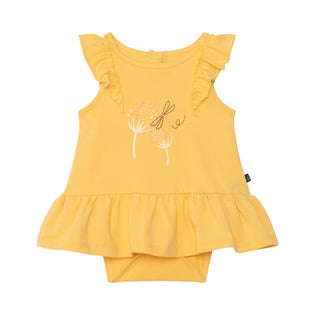 The Organic Cotton Romper Yellow boasts ultra-girly charm in a skirted silhouette with ruffle accents. This one-piece features ruffled flutter sleeves, a scoop neckline with snaps at the back of the neck, and a frill at the hem. It's detailed with bottom snaps and a dandelion and dragonfly print on the chest.