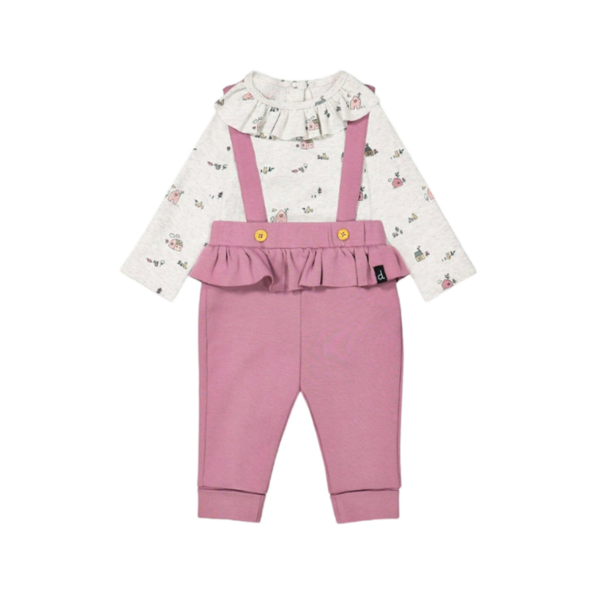 Little ruffles at the hips add a touch of texture to this organic cotton onesie and overall set. This comfortable set features a long sleeve onesie with a round ruffle neckline, bottom snaps, and an allover print. It layers perfectly beneath a suspender pant with crisscross straps in back.