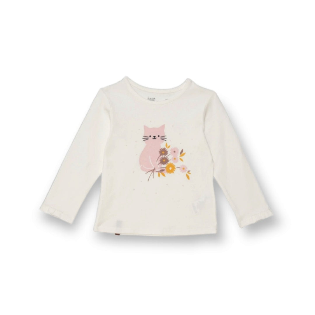 A cat and flower print makes the Long Sleeve Tee Shirt Off White a darling addition to any little girl's wardrobe. This stretch cotton tee shirt features long sleeves, a graphic print on the chest, a round neckline, and tiny ruffle accents at each wrist.