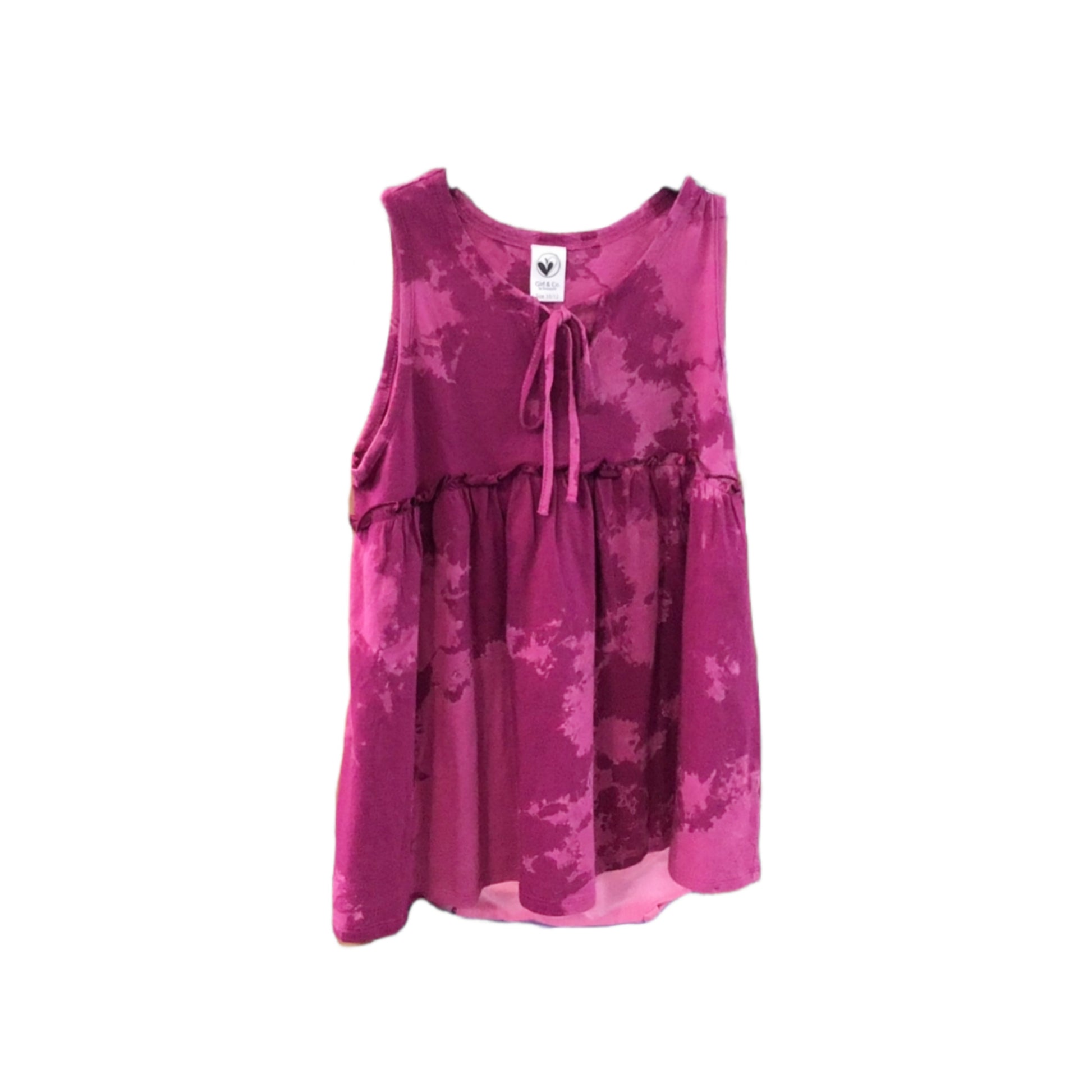 A relaxed summer tank top, the Danita is a bold yellow and lime tie dye shirt with a ruffle empire waistline detail and decorative bow in the back.