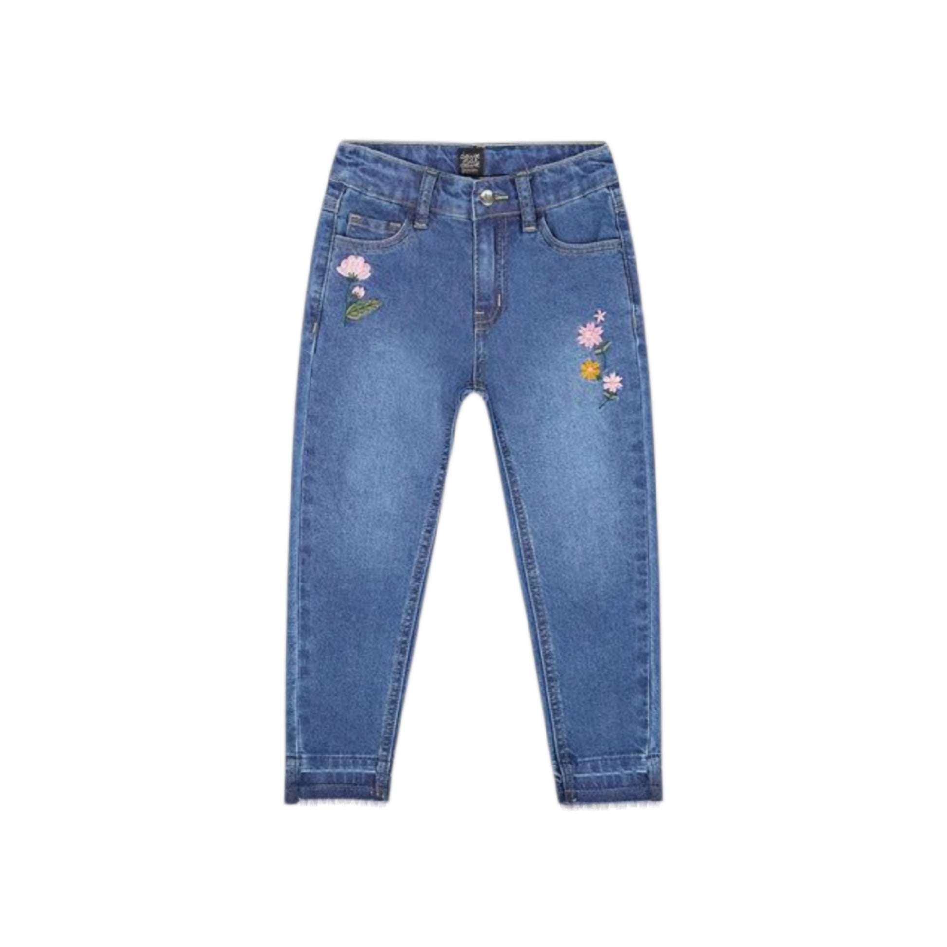 These stretch denim jeans feature a slim fit, delicate floral embroideries on the front, and frayed hems for a lived-in look, with classic front and back pockets.