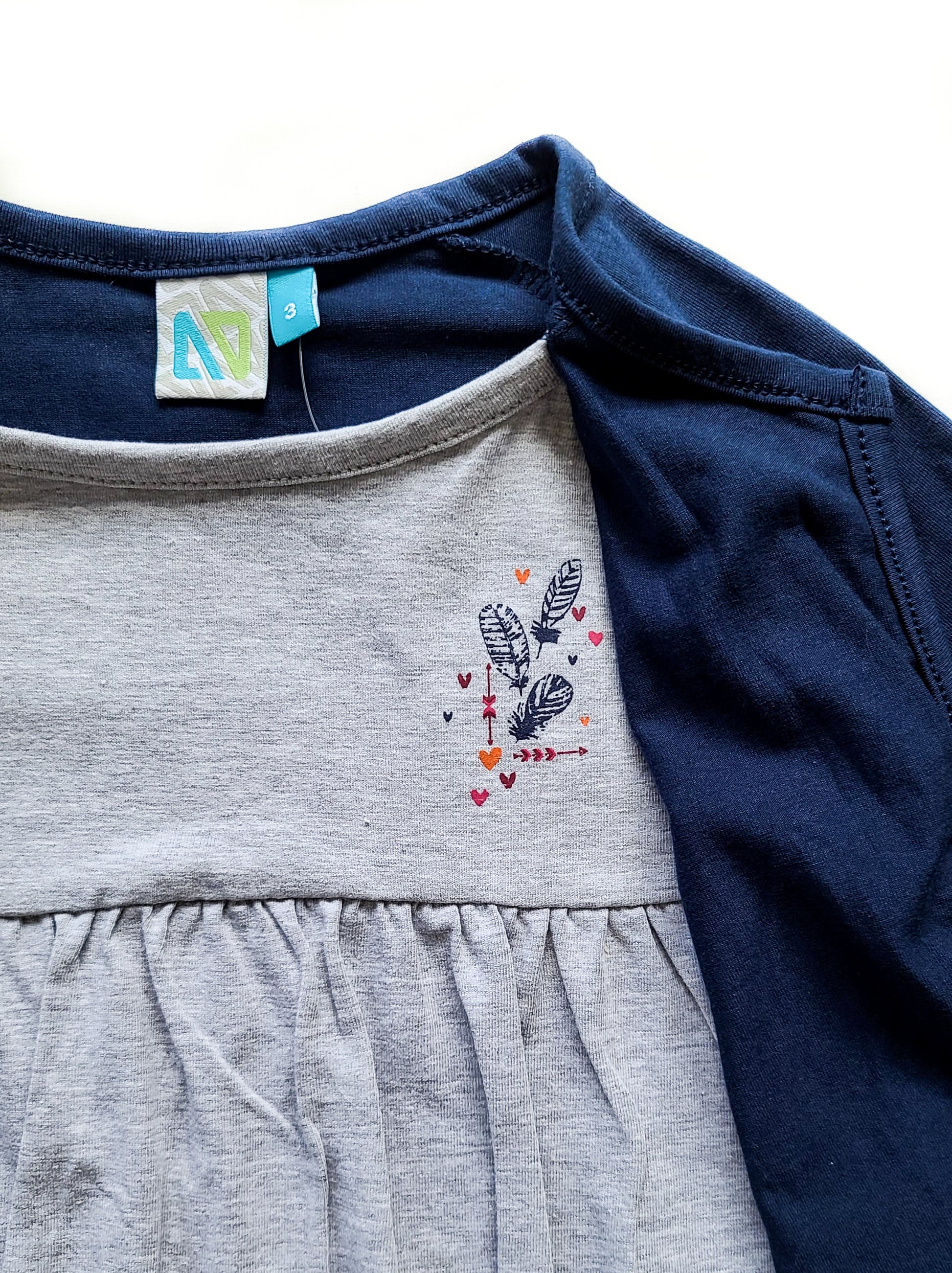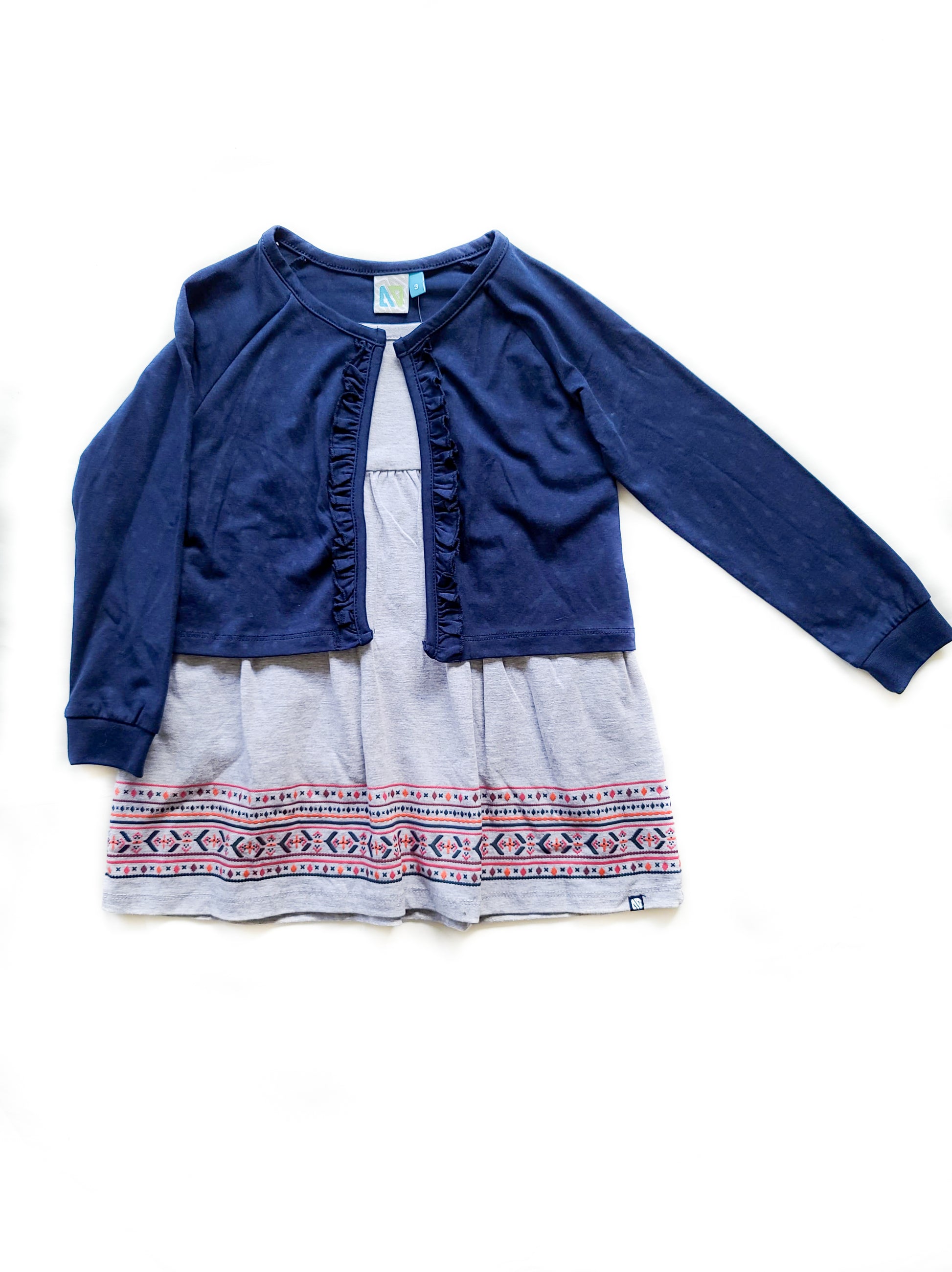 This is a grey tunic and cardigan combination. This one-piece gives the illusion of two pieces. The cardigan features ruffles down the edging and subtle polka dots while the grey undershirt has a hemline graphic as well as a small graphic over the left chest.