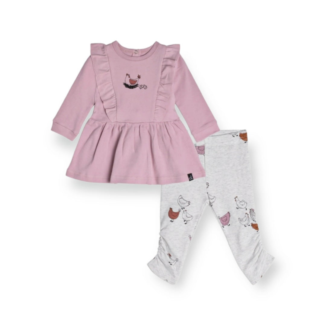 A playful hen print adds whimsical style to our Organic Cotton Dress and Leggings Set Hen Print Dusty Purple and Beige. The dress features a flared silhouette with long sleeves, double front frills, a round neckline, and back snaps. A ruched legging with an elastic waistband layers underneath for added comfort and coverage.