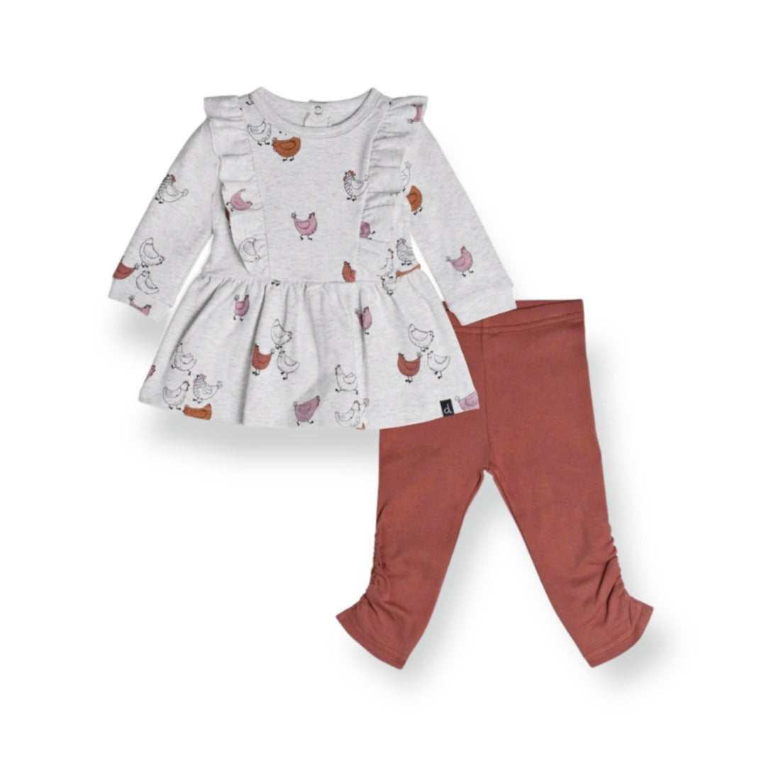 An allover hen print adds whimsical style to our Organic Cotton Dress and Leggings Set Hen Print Rust and Beige. The dress features a flared silhouette with long sleeves, double front frills, a round neckline, and back snaps. A solid ruched legging with an elastic waistband layers underneath for added comfort and coverage.