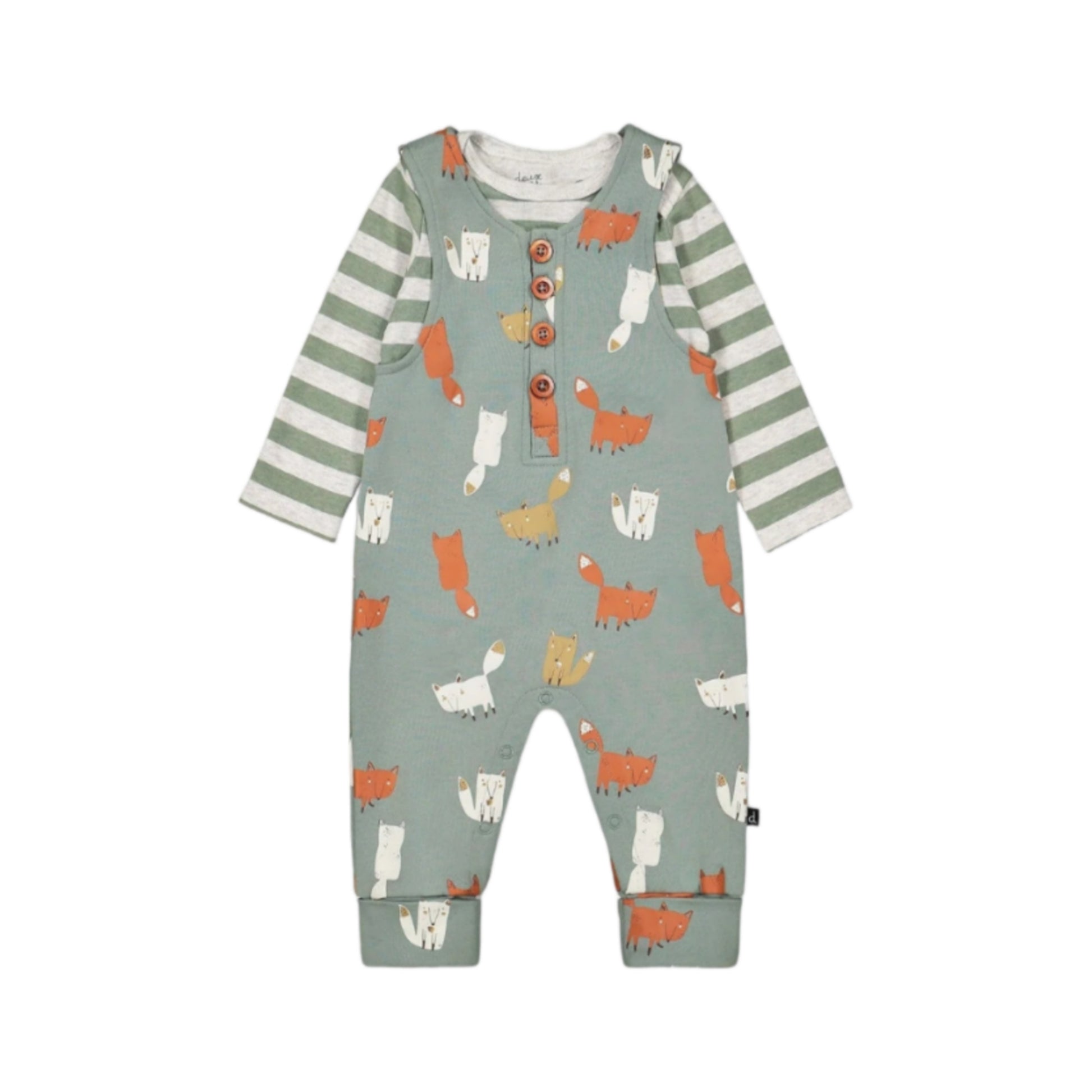 The onesie features long sleeves, horizontal stripes, a round neckline, and bottom snaps. The overall features wide straps, a scoop neckline, four front buttons, and adapting to the grow of your little one's with a foldover band at ankles.
