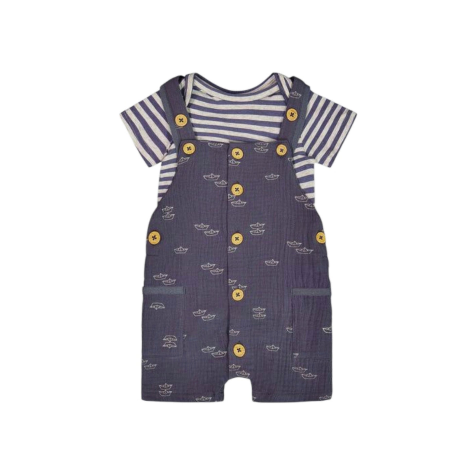 Made from soft and lightweight muslin fabric, this overall features wide straps, contrast buttons down the front and on the hips, and side pockets on each leg.