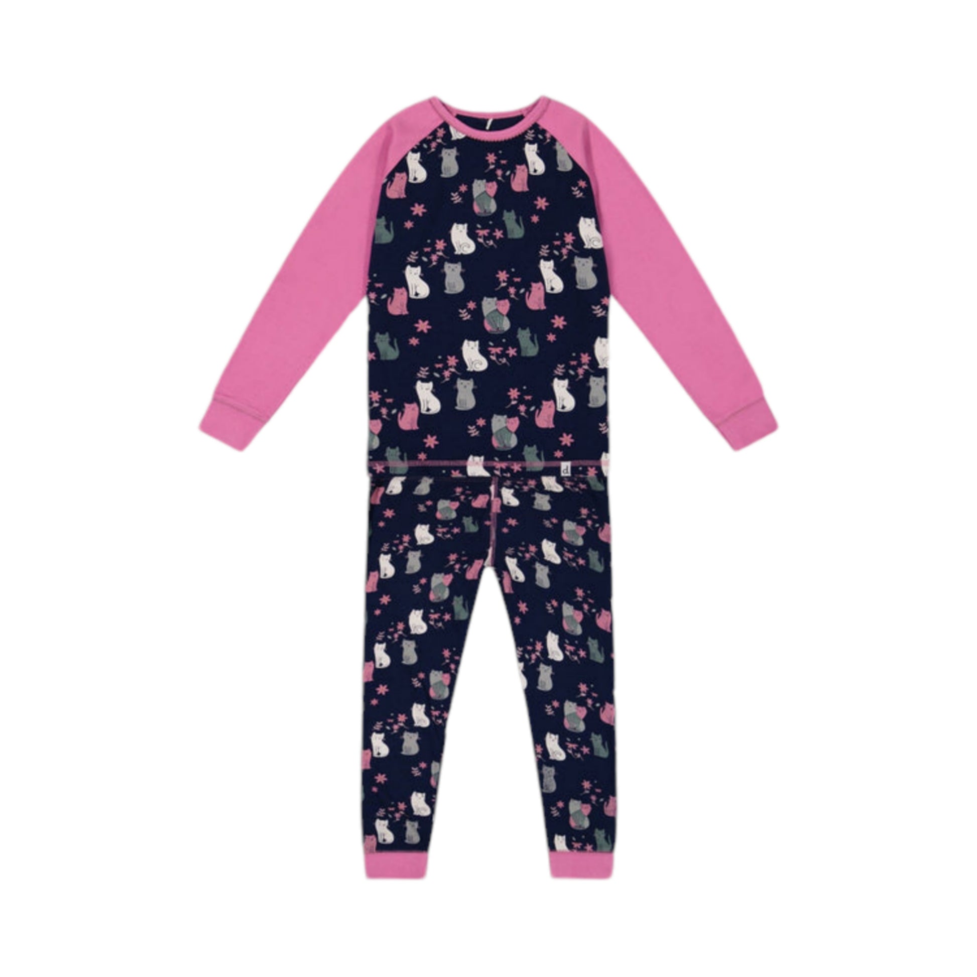The long raglan sleeve top features a round neckline and a large graphic print on the chest, while the coordinating pant features a stretch elastic waistband, solid trim at each ankle, and an allover squirrel, bunny, and acorn print.