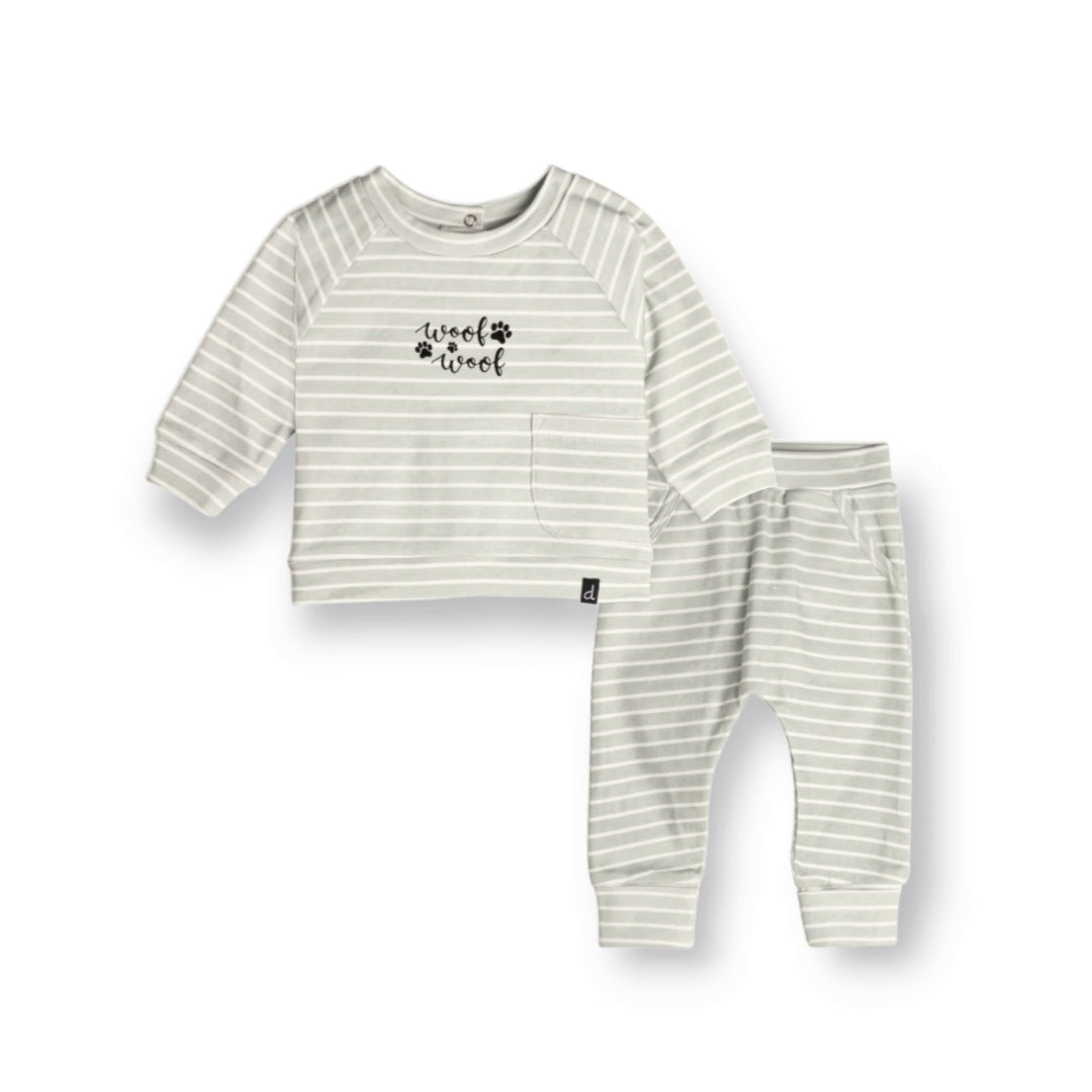 They're sure to adore the comfortable fit and cozy feel of our Organic Cotton Striped Top and Pant Set Green-Grey. The pullover top features long raglan sleeves, a crew neckline, and a patch pocket. The pants boast a stretch waistband, folded cuffs, and slant front pockets.