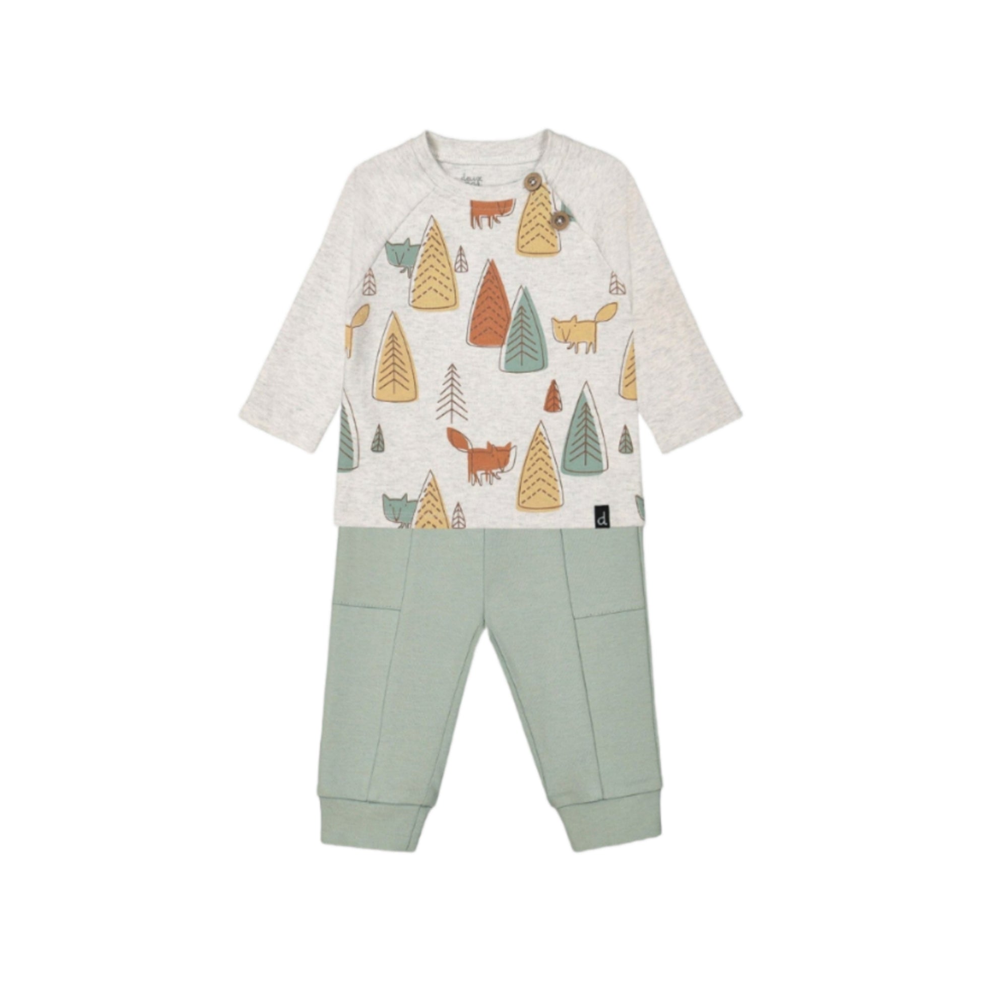 This set includes a long raglan sleeve top with a crew neckline and buttons on the shoulder. It's teamed with an elastic waist pull-on pant with vertical seams and side pockets.