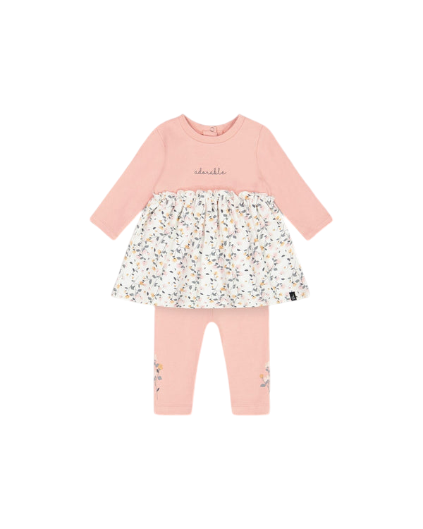 This darling set features a two-tone top with long sleeves, a round neckline, and a shirred bodice with a pretty allover floral print. We've paired it with solid elastic waist leggings with an easy pull-on fit and little flowers on each leg.