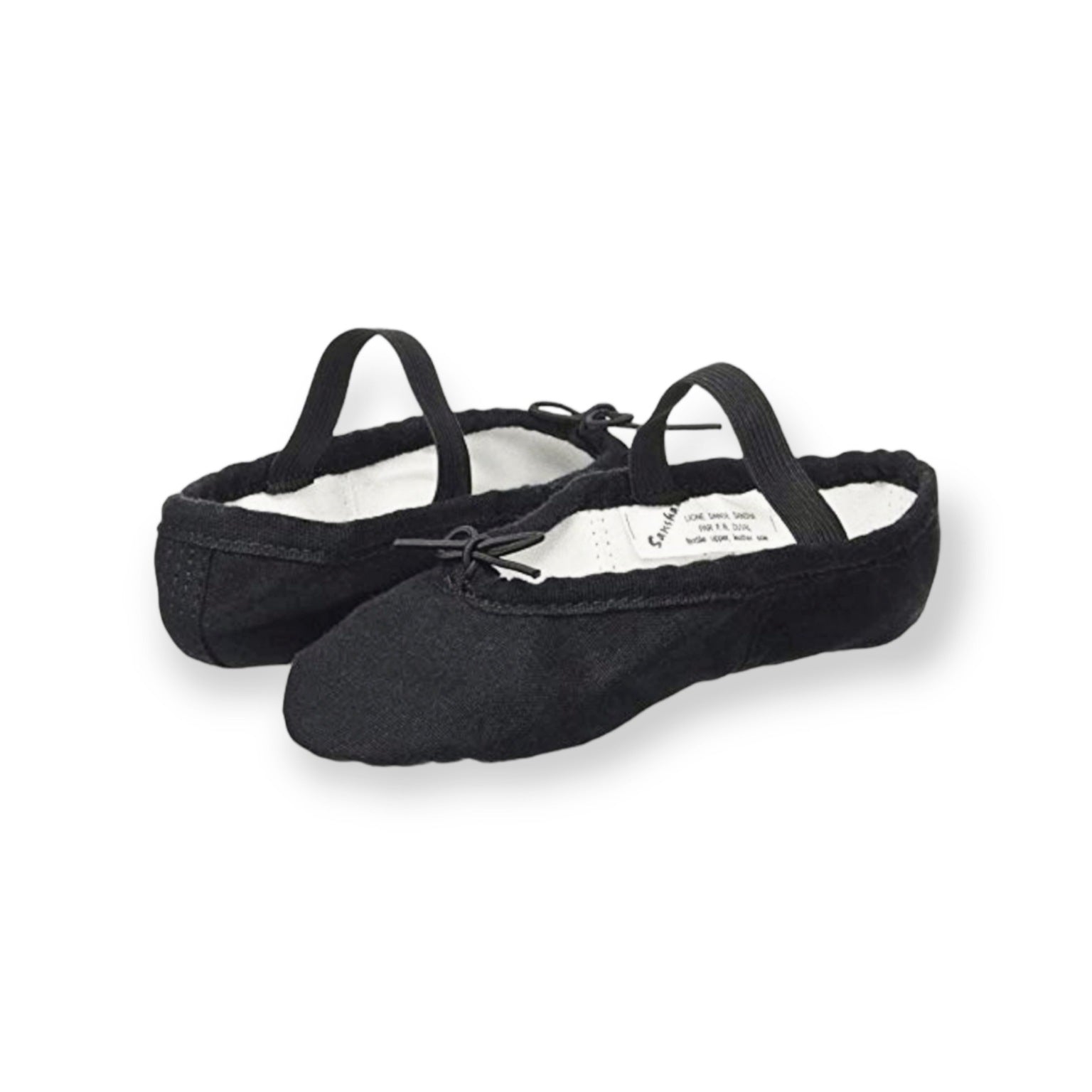 The stream-lined design kid's ballet shoes is an absolute must! Full sole canvas ballet shoe in black.