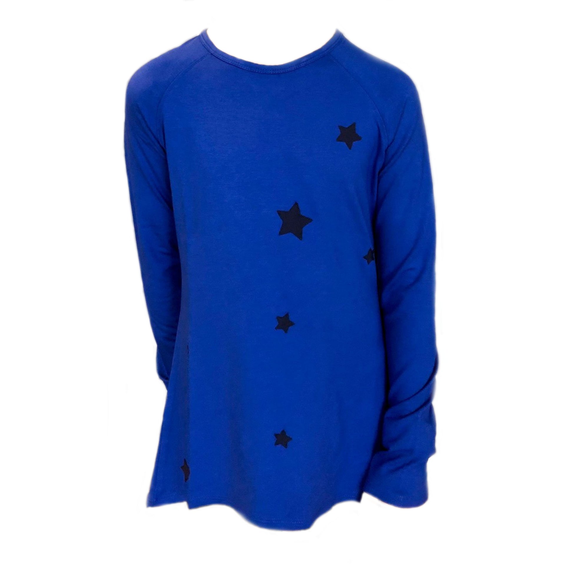 The Reina long sleeve top is a tween favorite, featuring contrasting star appliques on a solid cobalt blue. The back neckline also has a sweet bow tie detail making it a statement on the front and back.